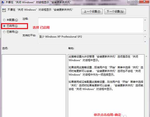 找到并双击“不要在“关闭Windows”对话框显示“安装更新并关机””选项。