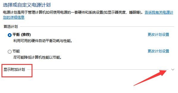 5、进入后,我们可以看到几种电源模式,其中我们可以修改电源模式,可以选择平衡模式、节能模式或者展开隐藏的附加方案,选择高性能模式,如下图所示。