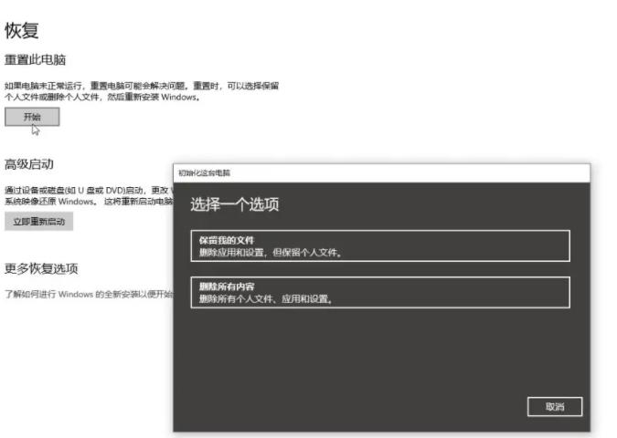 3、点击重置此电脑下的开始,选择“保留”或“删除”文件,即可恢复出厂设置。