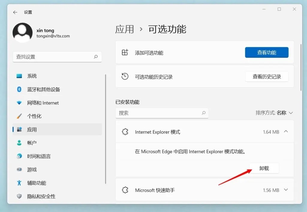 2、在可选功能设置中找到想要删除的功能,然后点击下方的卸载即可移除该可选功能。