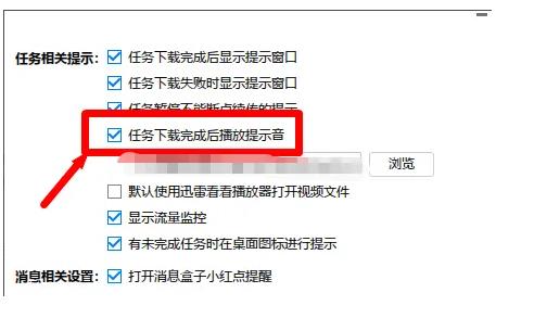 3、然后在任务相关提示列找到“任务下载完成后播放提示音”,取消之前的勾选,点击“确定”保存。