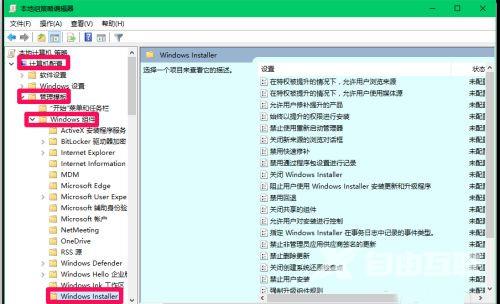 2、进入到组策略编辑器后,依次点击左侧栏中的"计算机配置——管理模板——Windows组件——windows Installer"。