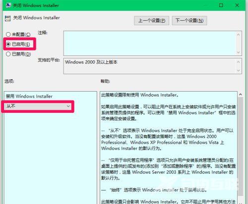 4、最后在给出的窗口中,将左上角的"已启用"勾选上,并将"禁用windows Installer"设置为"从不",随后点击应用确定保存就可以了。