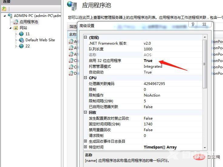 在应用程序池中,选择与你项目相同名字的项,右键高级设置,将如图项选择true,应用。