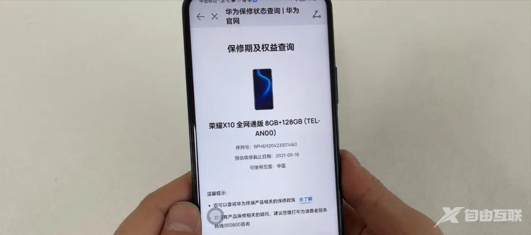 大家可以看一下,这样的话会查询到手机的一个基础信息,我手机这个型号是荣耀x10的全网通8+128g我们主要看的是下方预估保修截止日期,它显示是2021年5月18日到期,我是2020年5月18日入手的这款手机。