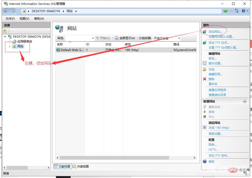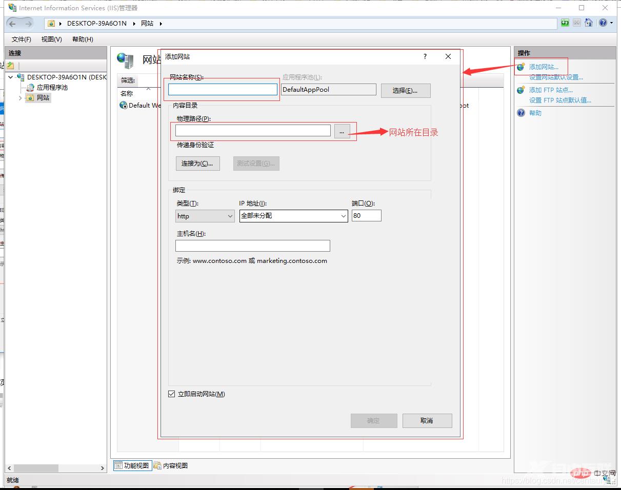 点击“添加网站”后,进入页面填写网站相关内容,如:网站名称、物理路径(网站所在文件夹),点击“确定”创建成功