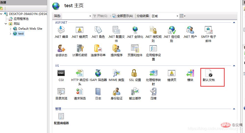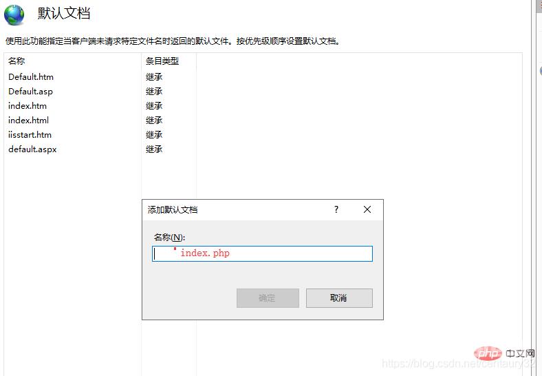 点击“默认文档”,鼠标右击“添加”按钮,添加默认文档,输入index.php,点击“确定”添加