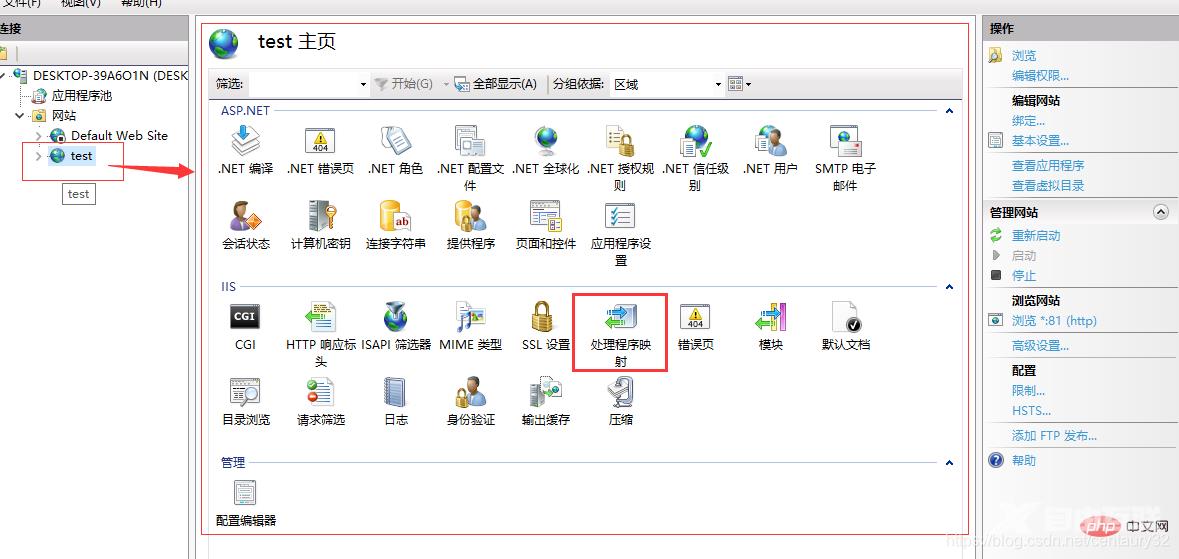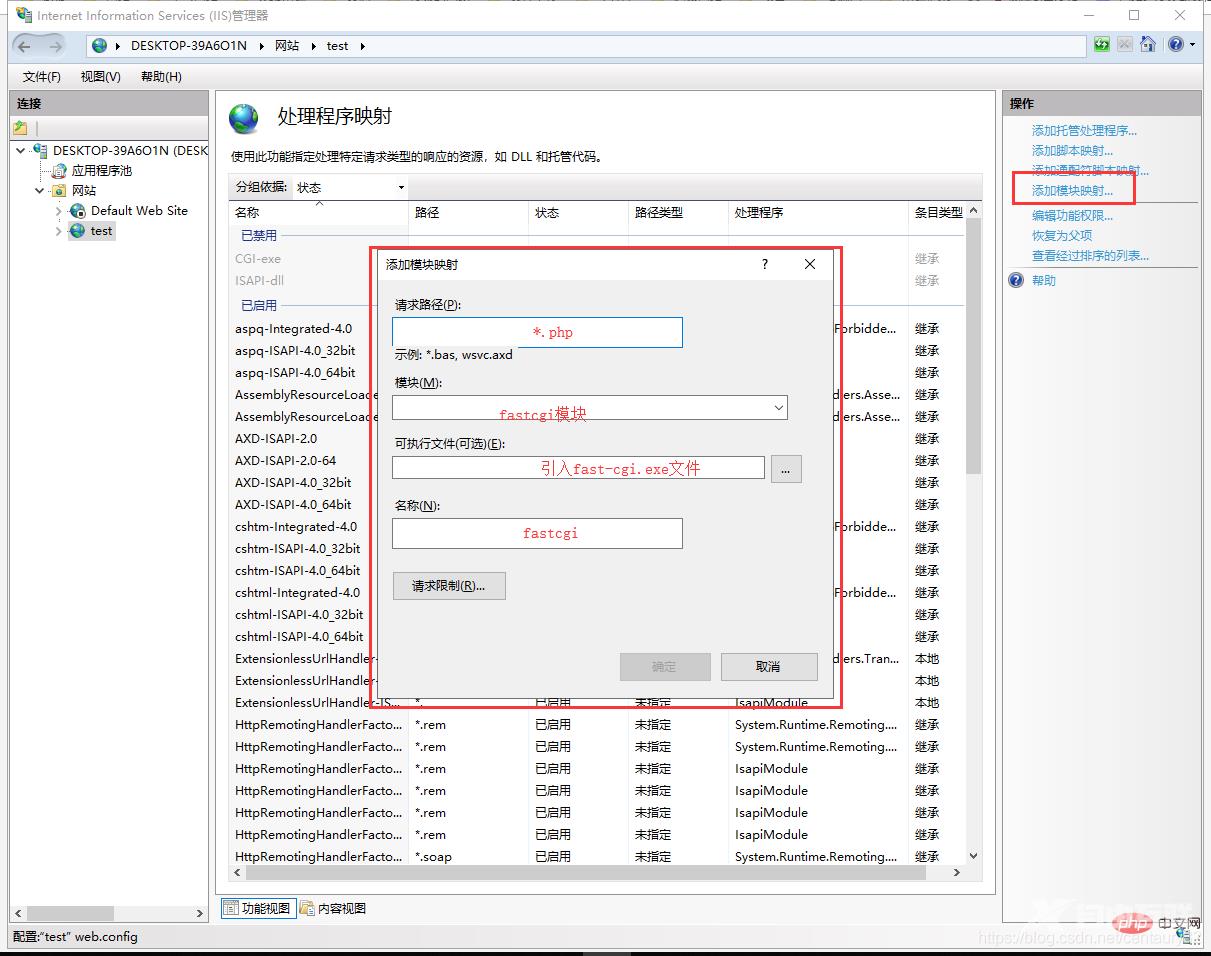 点击创建好的网站,点击“处理程序映射”,点击右侧的“添加映射模块”,在弹出层中输入对应的参数,点击确认