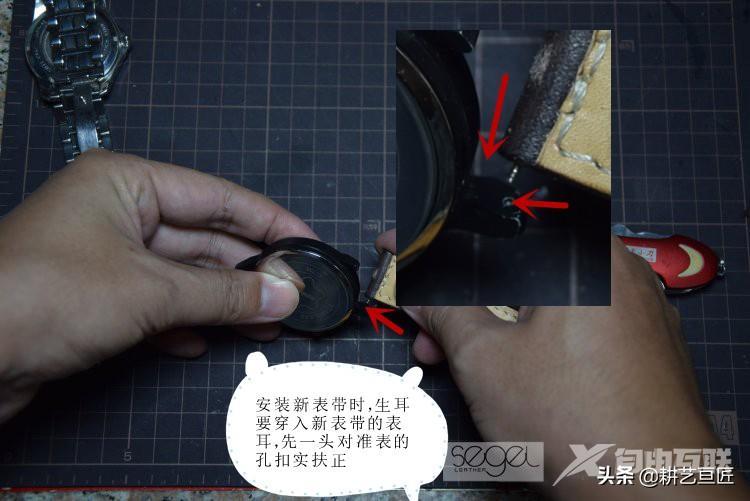 安装新表带时,先检查拆下来的表耳针 有没有坏了。左右按压一下看看弹力。如果无弹力,生锈卡死及时更换新的耳针。将耳针装入新表带,再开始安装。