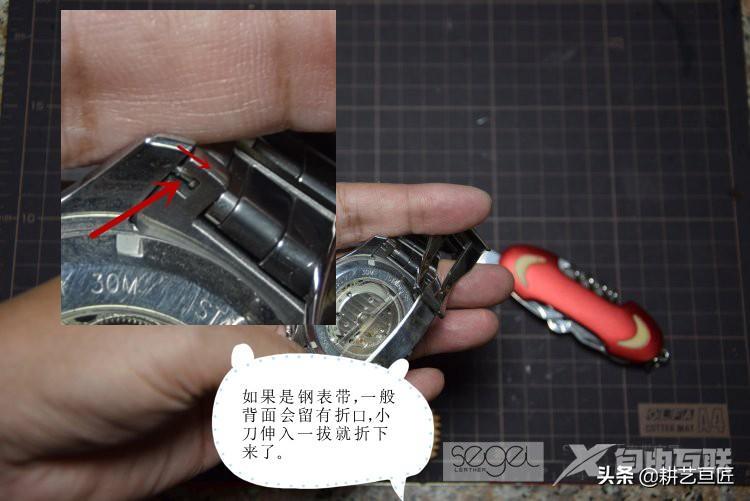 当你的表是钢带时,一般钢带的背面有一个拆口,用刀尖伸入抠一下,就出来了。