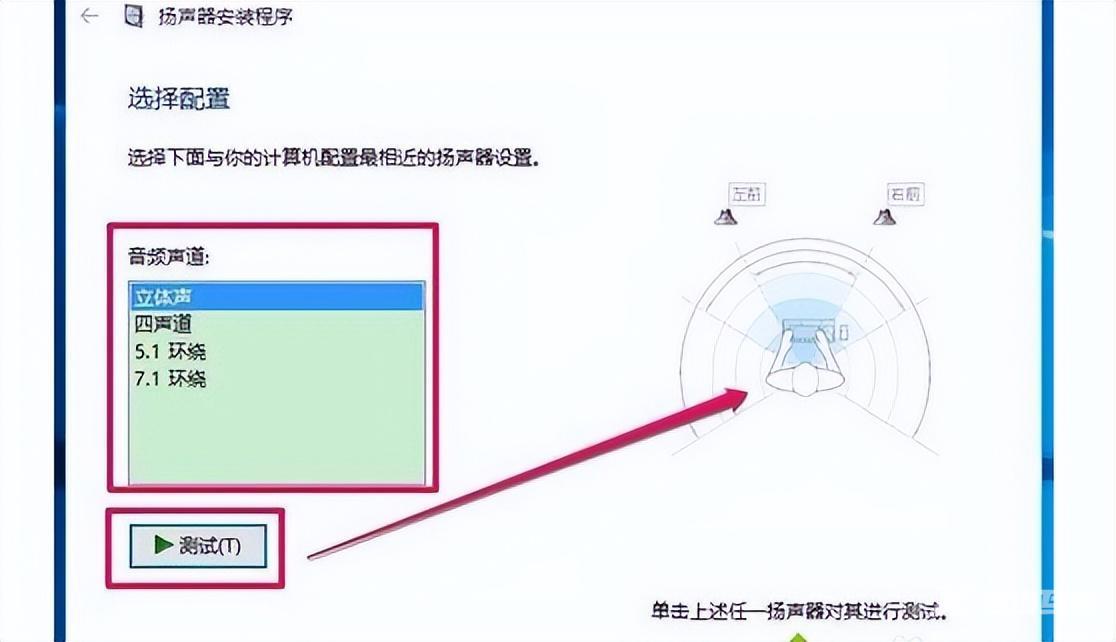 8、 最后,点击“配置”,即可在音频声道中点击“测试”声音