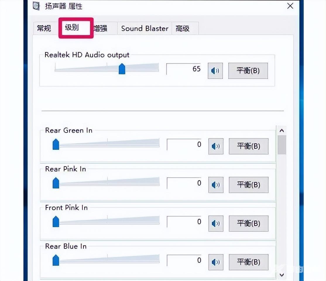 5、 点击级别,调整Realtek HD Audio output为:65等等