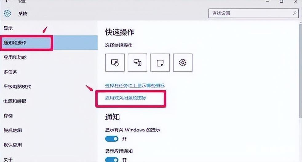 1、 点击左侧“通知和操作”,再点击右侧“启用或关闭系统图标”