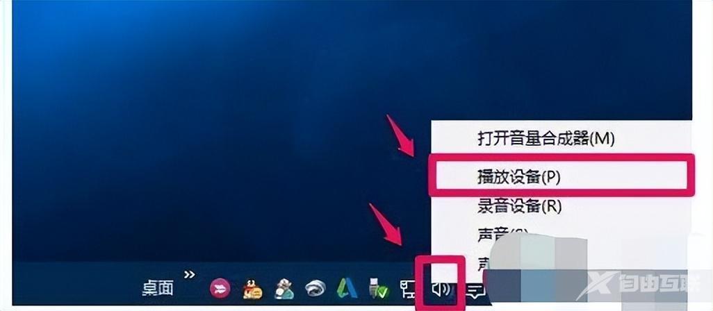 3、 如果桌面任务栏显示了音量图标,而电脑还是没有声音的话,点击音量图标,选择播放设备