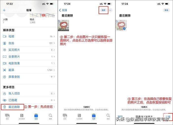 当我们把相册从苹果手机里删除的时候,苹果手机相册里有一个自带的功能。就是苹果手机当中的“回收站”,此功能的作用是:删除的照片会保存到“回收站”中,保存的期限有30天,30天期间是可以把照片恢复到手机当中。而一旦超过了30天后,会自动永久的删除,删除以后在“回收站”是彻底的消失了。通过苹果相册里的“回收站”,苹果手机相册恢复怎么做呢?