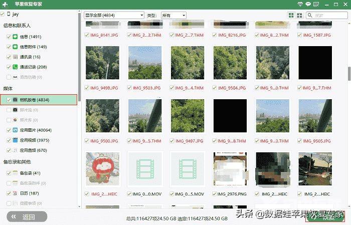 步骤3:扫描结果出来后,我们需要选择【相机胶卷】,则可以查看到自己删除的照片,勾选完成以后点击右下角【恢复即可】;