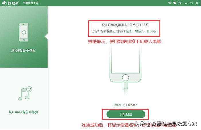 步骤1:选择一根USB数据线插入到电脑后,打开桌面上的软件,点击【开始扫描】的选项;