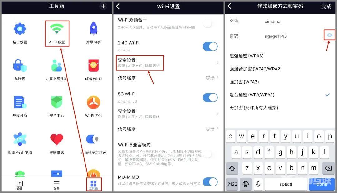 以小米APP为例,点击【工具箱-WiFi设置】,再点【安全设置】,点密码旁边的【?】(眼睛符号)就能看到密码了。