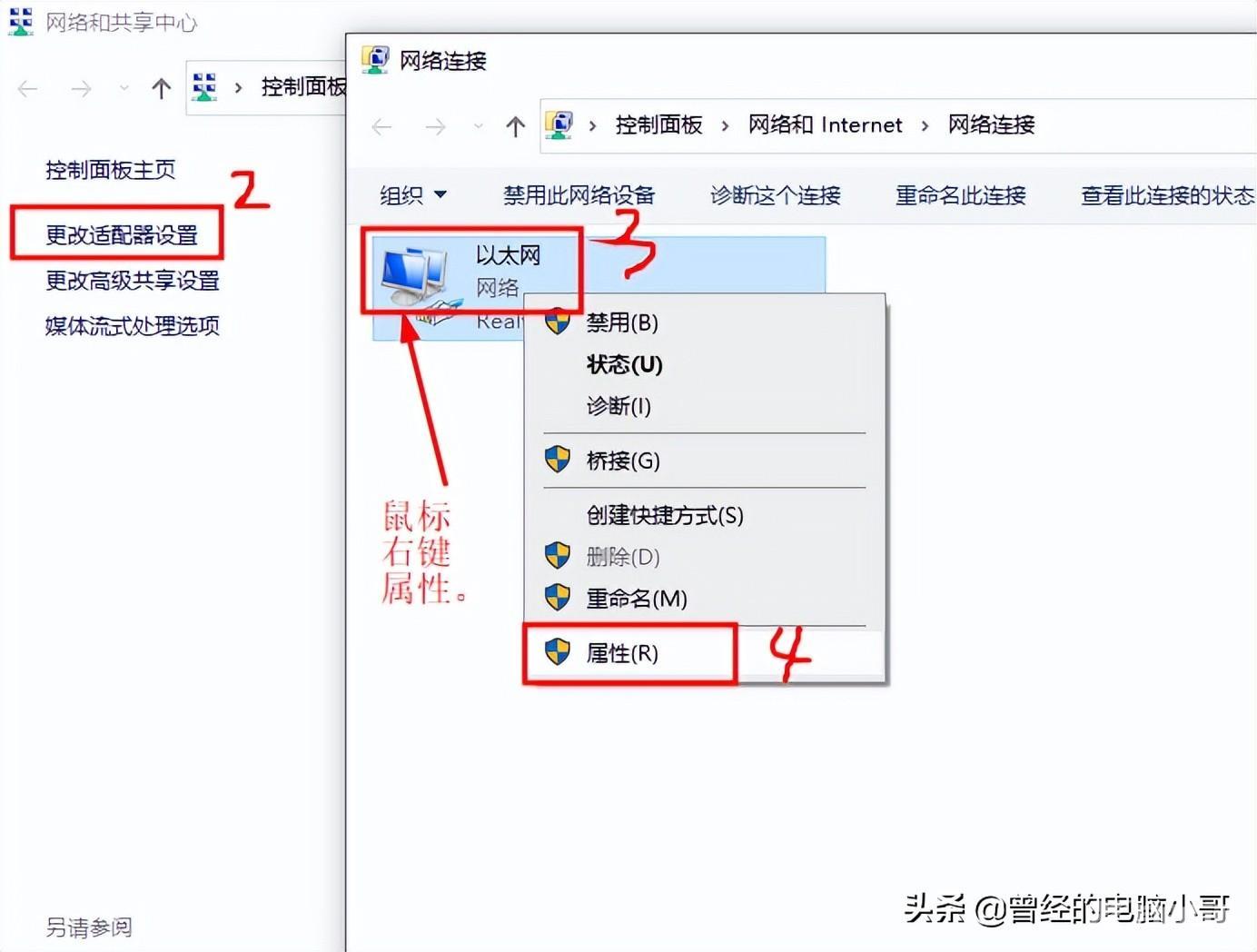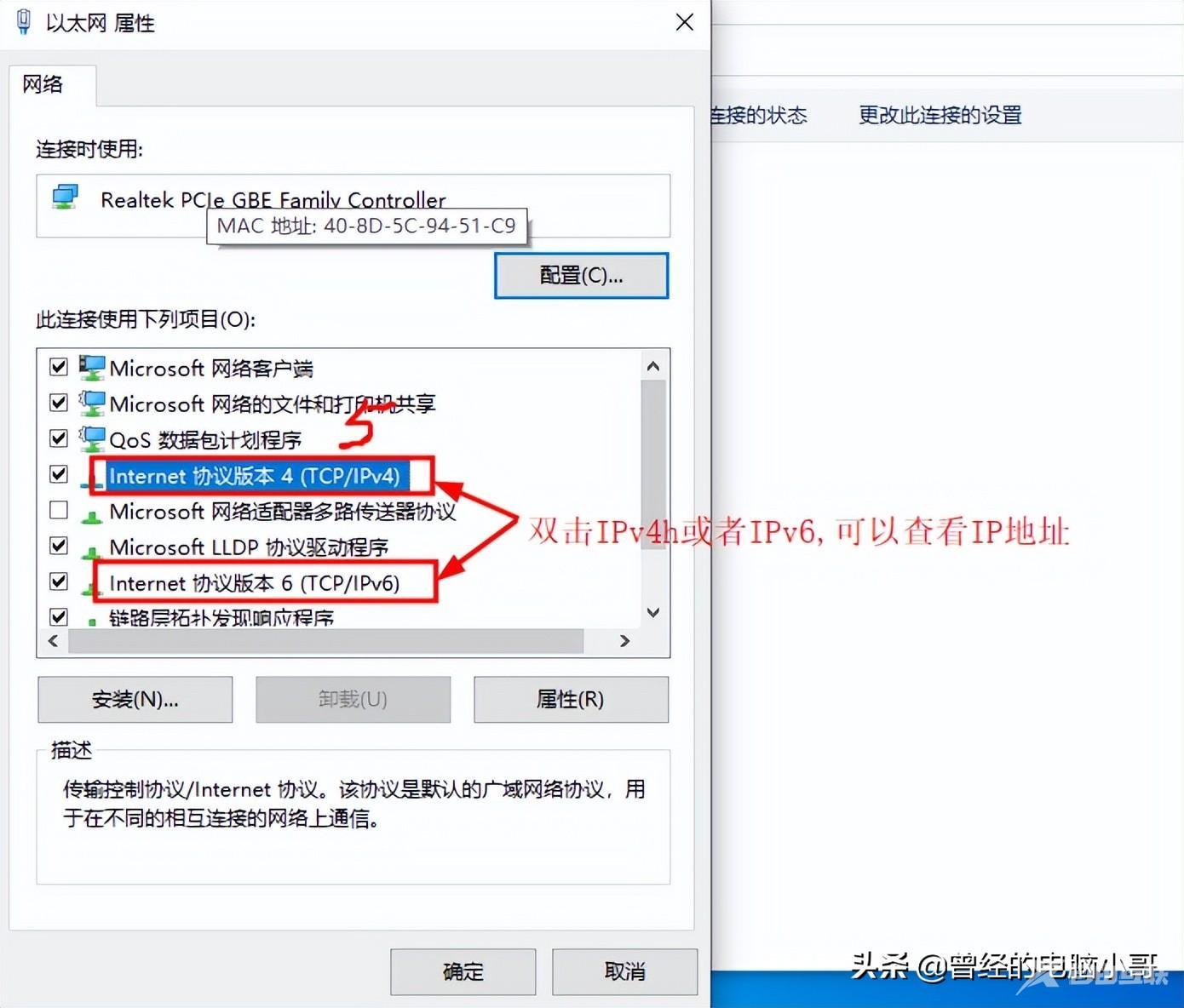 方法一:桌面上找到“网络”图标→右键鼠标点属性→更改适配器设置→以太网→右键鼠标点属性→双击IPv4或者IPv6即可查询IP地址。