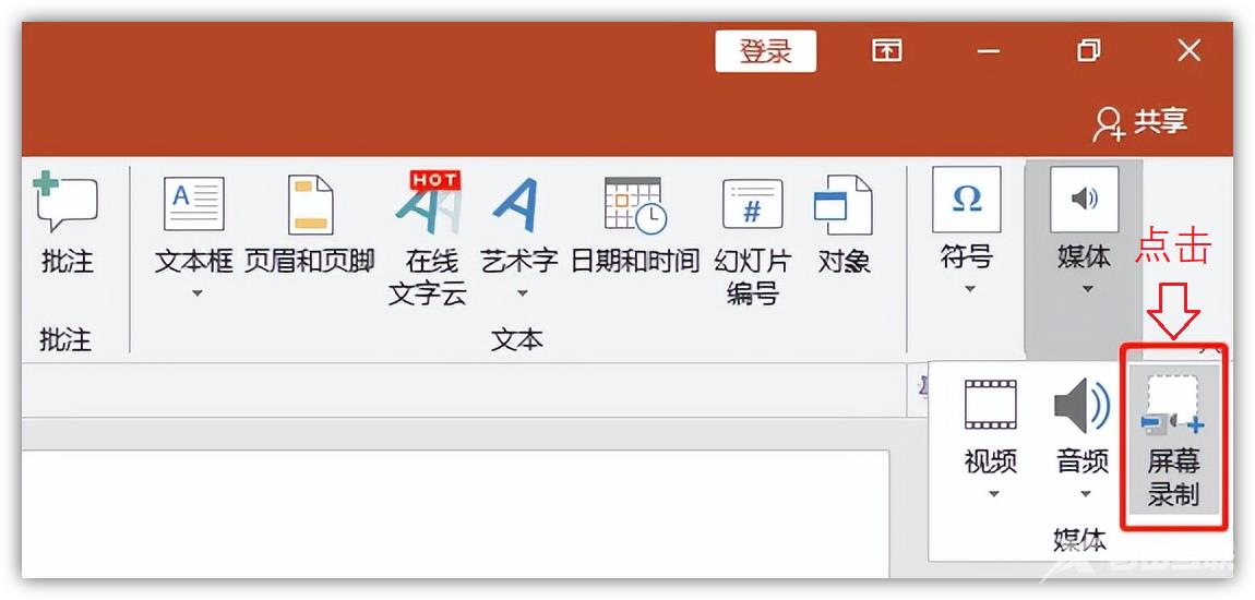 我们常用的办公软件PPT,也是自带录屏的功能,新建一个空白的PPT文件,点击菜单栏中的【插入】-【媒体】,然后找到【屏幕录制】功能。