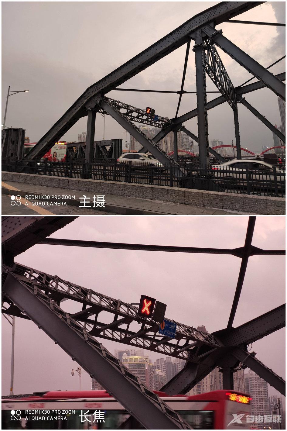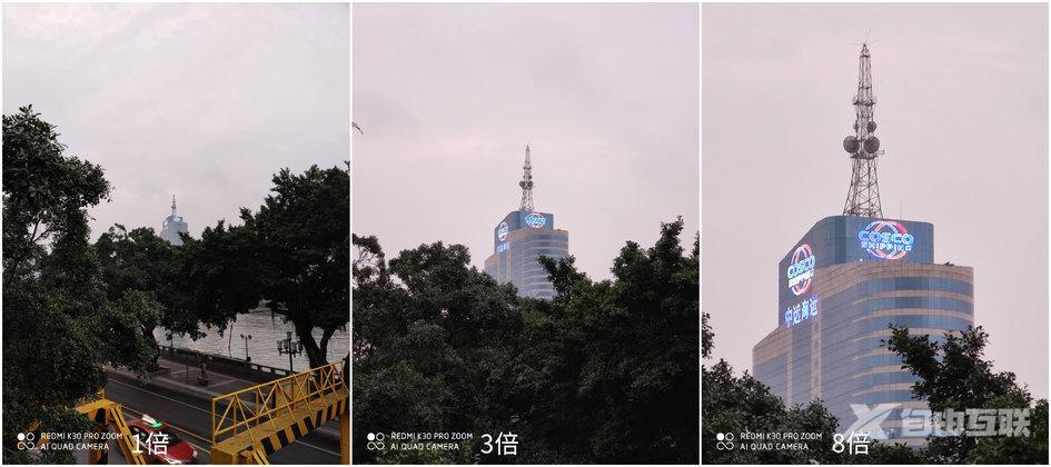 变焦倍数更大,就意味着远拍效果会更加清晰。从下方的样张可以看到,长焦镜头所拍摄的画面,确实比主摄裁切放大要清晰得多。放大 8 倍时,也有不错的成像表现。虽说 K30 Pro 变焦版支持最高 30 倍变焦,但如果再继续放大,画面质量会出现明显下滑。