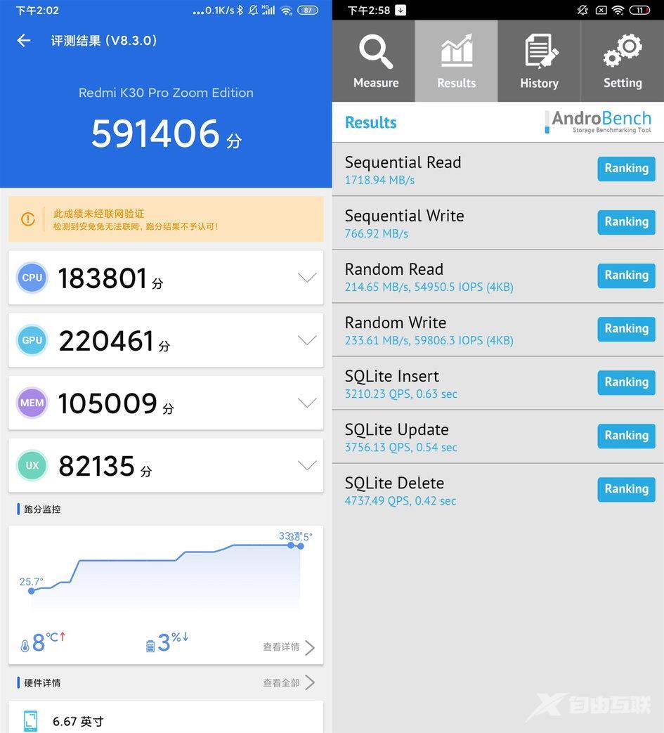 骁龙 865 + UFS 3.1 + LPDDR5,Redmi K30 Pro 的性能没有担心的必要,常温下安兔兔 59 万分随便拿。