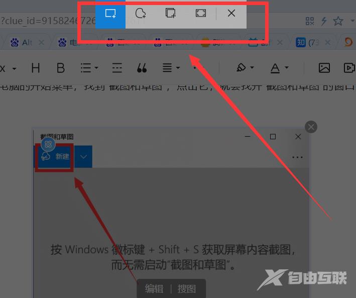 然后点击上图的“新建”按钮,就会在屏幕顶部显示几个按钮(如下图),第一个按钮是截取任意大小的矩形,第二个是按钮是截取任意形状,第三个按钮是截取活动窗口,第四个按钮是截取全屏。当然,我们也可以同时按下“win键+Shift+S键”,也能打开这几个按钮。