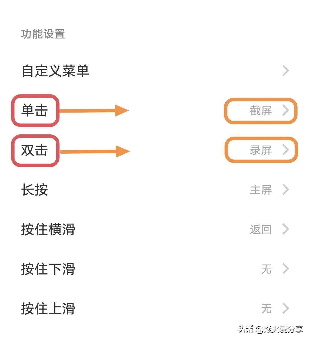 有单击、双击等6种不同的手势操作,每种都可以对应选择一种功能,比如你可以选择单击设置为截屏,双击设置为录屏。
