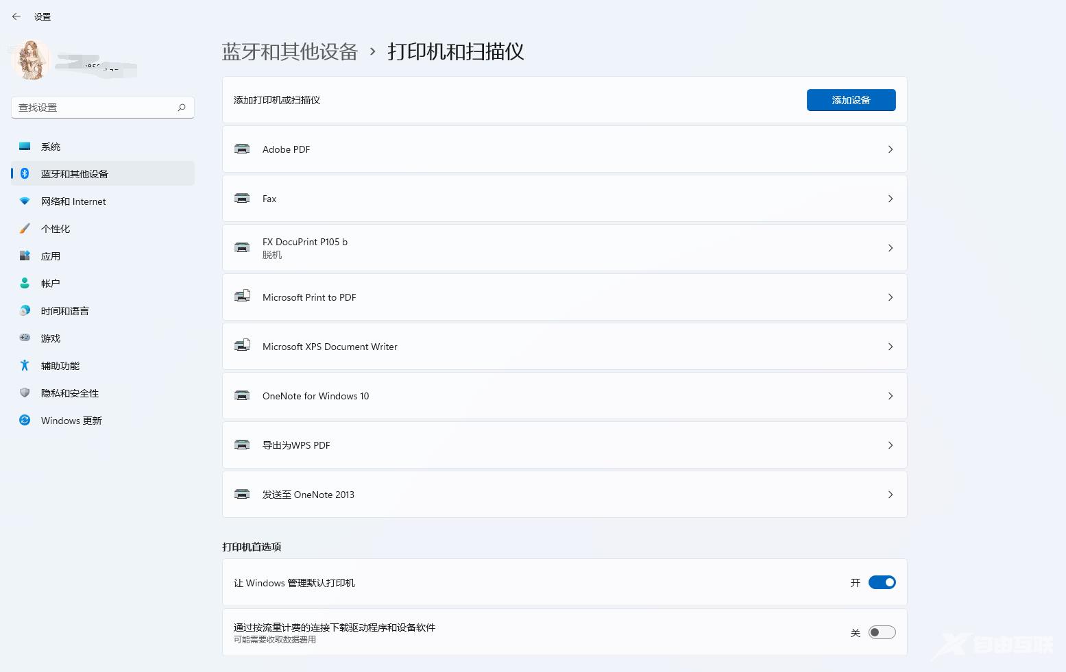 2、在已经进入的设置页面里,左侧蓝牙和其他设备-打印机和扫描仪中