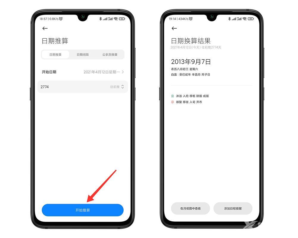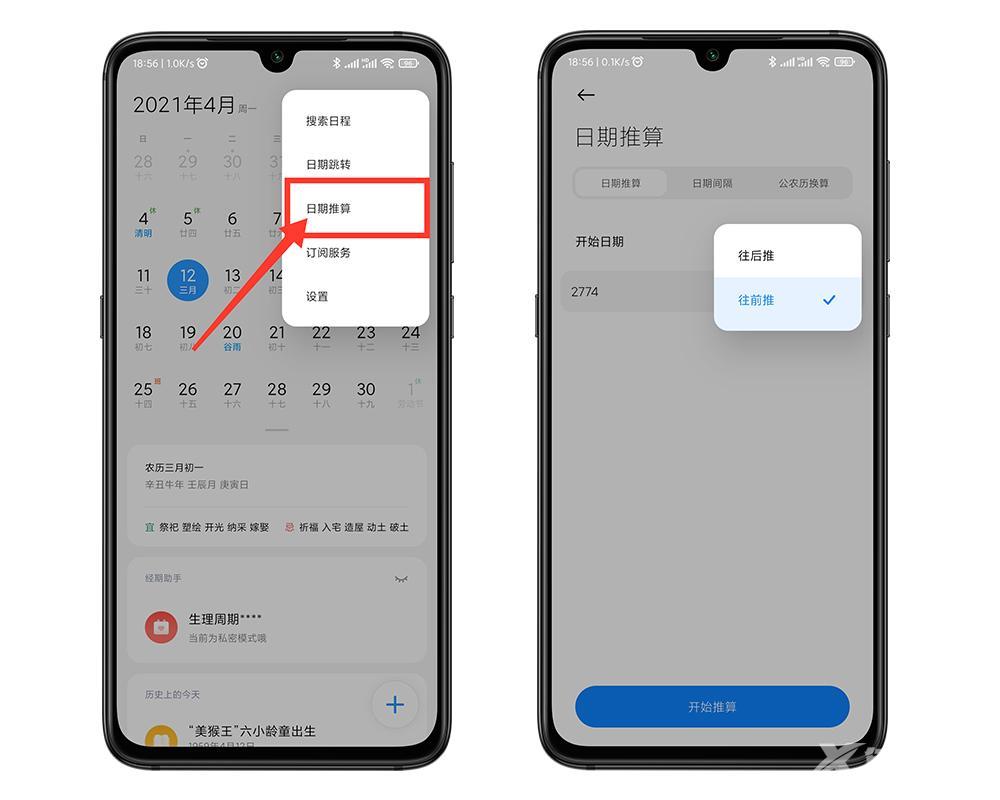 打开日历,点击右上角三点菜单,选择“日期推算”,开始时间默认选择为当天,下面一栏输入天数,后面一栏选择为“往前推”。