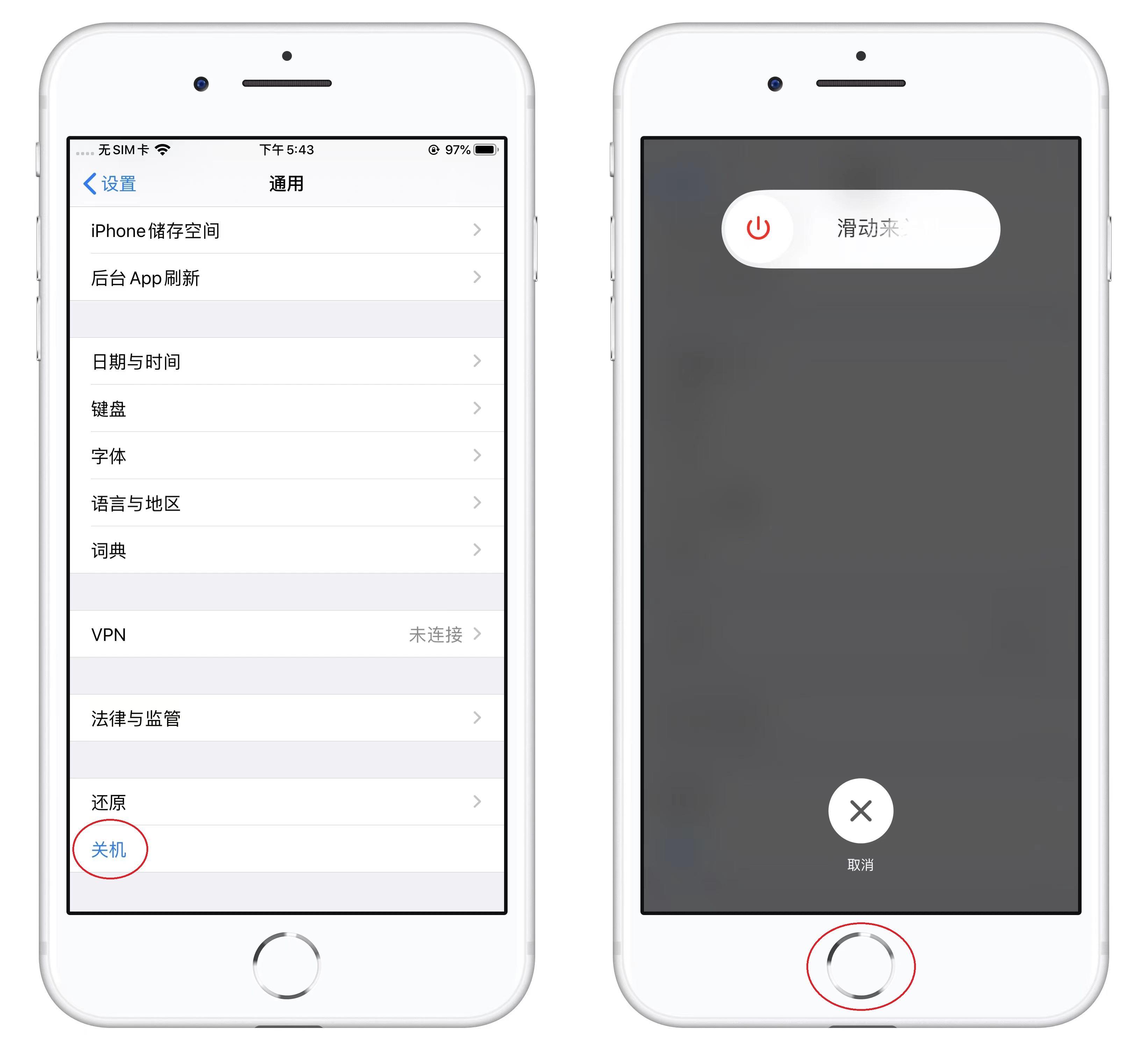 返回到通用界面,滑到最底部,点击【关机】,随机跳出关机界面,此时无需关机,长按底部的home键5秒上,重新输入锁屏密码,就能清理其他缓存。