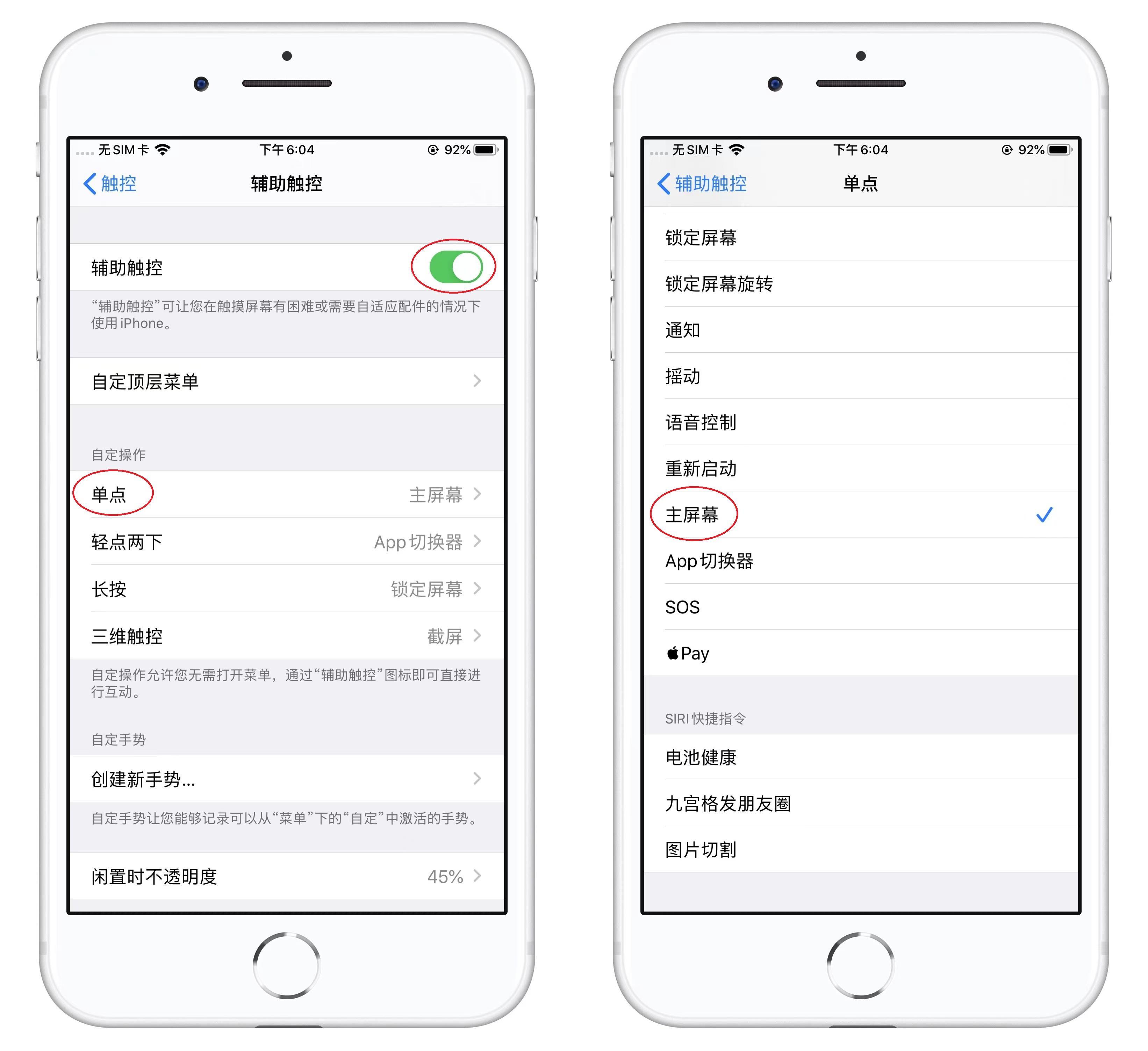 然后开启辅助触控小白点,自定义操作,将“单点”设为“锁定屏幕”,这样在关机界面,就可以长按小白点,替代home键了。