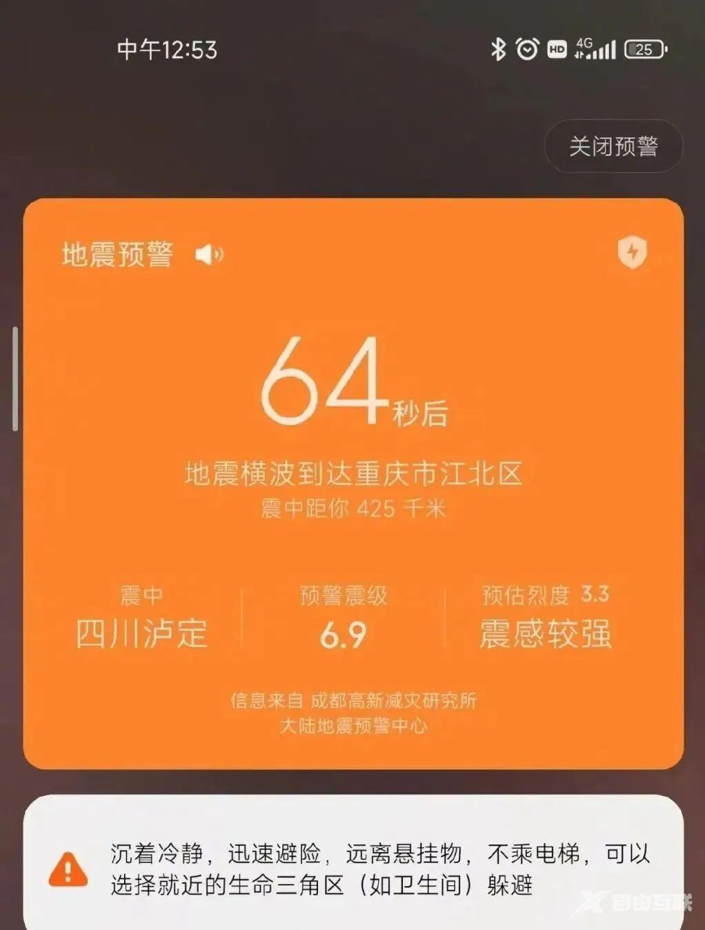 有不少媒体报道,地震发生前,四川、重庆居民发了自己手机中的地震预警,其中一名重庆网友预警截图显示,“64秒后地震横波到达重庆市江北区,震中四川泸定,预警震级6.9级,震感较强。”