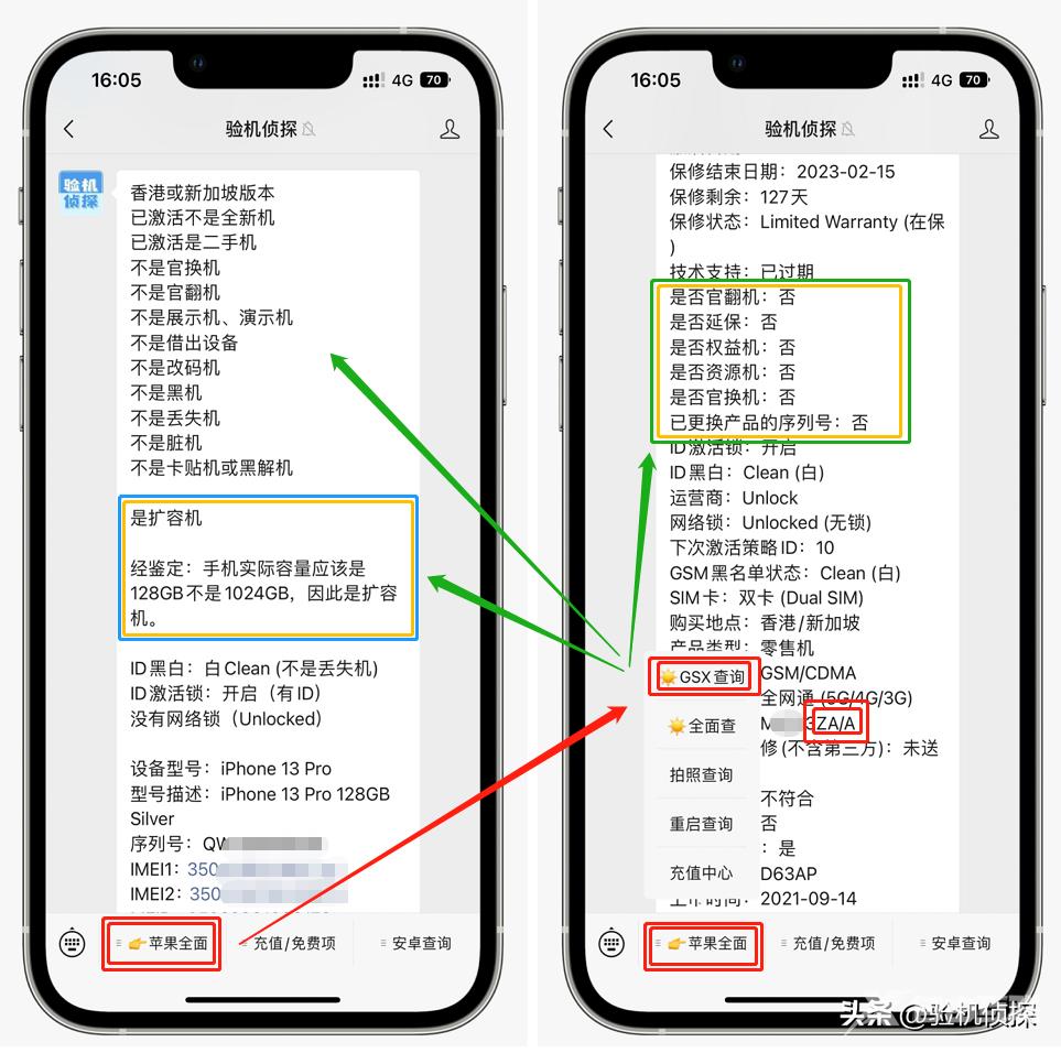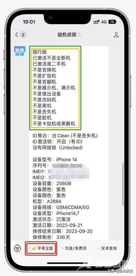 可以使用IMEI 码或者序列号,通过“验机侦探”查看机器底层数据的激活状态,如果是有问题的机器可以直接通过“全面查”显示出来,而官网上查看没有这么全面,并且一半小白朋友们会看不懂官网给出的数据。