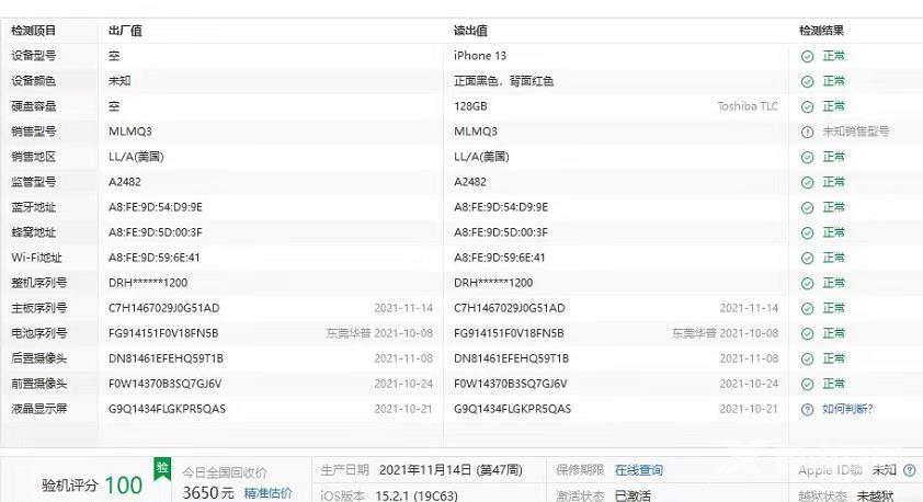 (图3)但是这台iPhone13该机的验机报告全绿,验机报告看的是硬件信息,如果iPhone有隐藏ID、有配置锁、有网络锁、拉黑设备等等,是看不出来的!当然验机报告也能改,所以要注意,现在验机报告只能作为参考,不能当真!