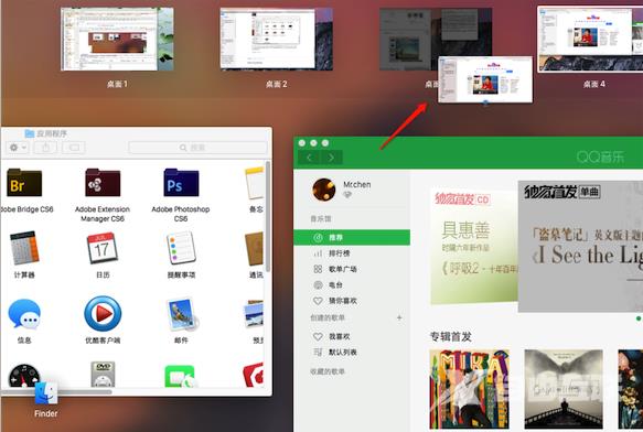 备注2:Mac OSX10.9中,Mission Control会自动将一个桌面中堆叠覆盖的不同应用程序为我们分开并且标注APP名称。如下图中的QQ音乐,Chrome和Finder。 如果应用程序相同且窗口不止一个,会出现覆盖现象,使用二指上下滑动,可以展开窗口,方便正确选择要移动的窗口。