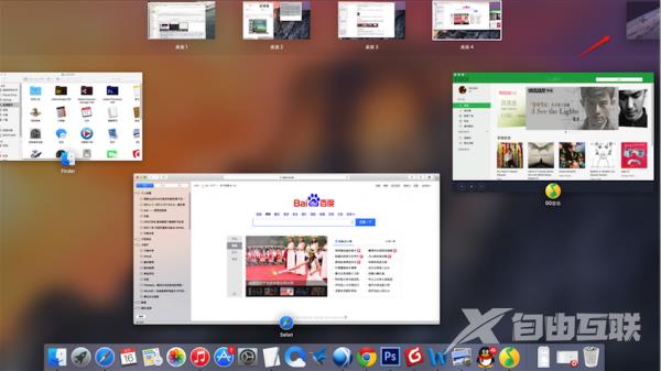 在Mission Control中,我们可以拥有不止一个桌面。鼠标移到右上角,会出现一个新建桌面的加号。点击即可新建一个桌面。如下图,共有3个桌面和两个最大化的APP即safari和QQ音乐。