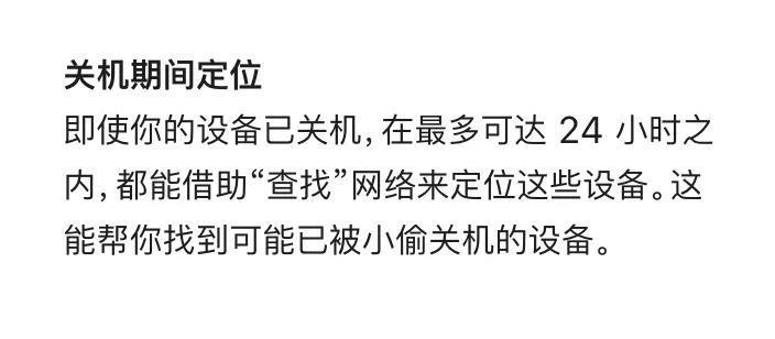 不过还需要注意的是,iOS 15「关机定位」并非一直有效,根据苹果官网的介绍,该功能的持续时间最长可达 24 小时。其他机型升级 iOS 15 后可以在关机界面查看是否出现「iPhone 关机后仍可找到」的提示