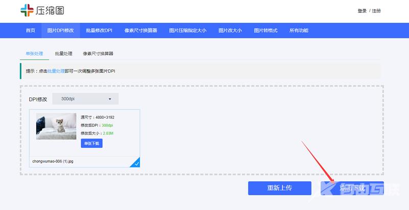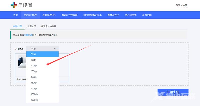 上传图片后选择dpi修改数值,支持将图片分辨率改为72、96、100、300、350dpi等。