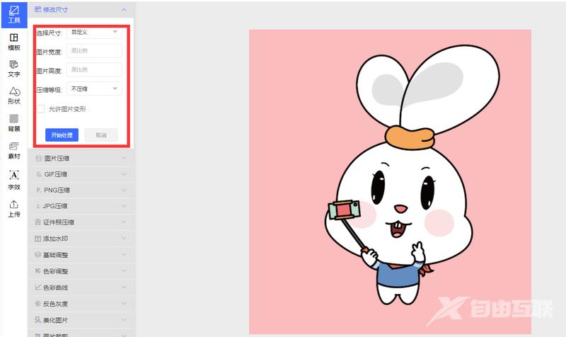 点击选择图片,在左侧工具栏中输入我们想要的图片宽、高(输入其中任意数值,系统自动修改图片尺寸),最后保存图片即可。