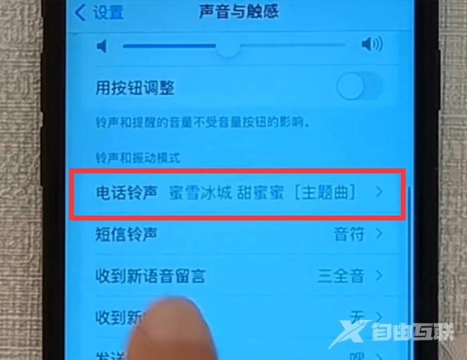 然后点击“声音和触感”,进入“声音和触感”界面,我们在“电话铃声”的选项里,就可以看到,电话铃声已经是《蜜雪冰城甜蜜蜜》(如下图)。