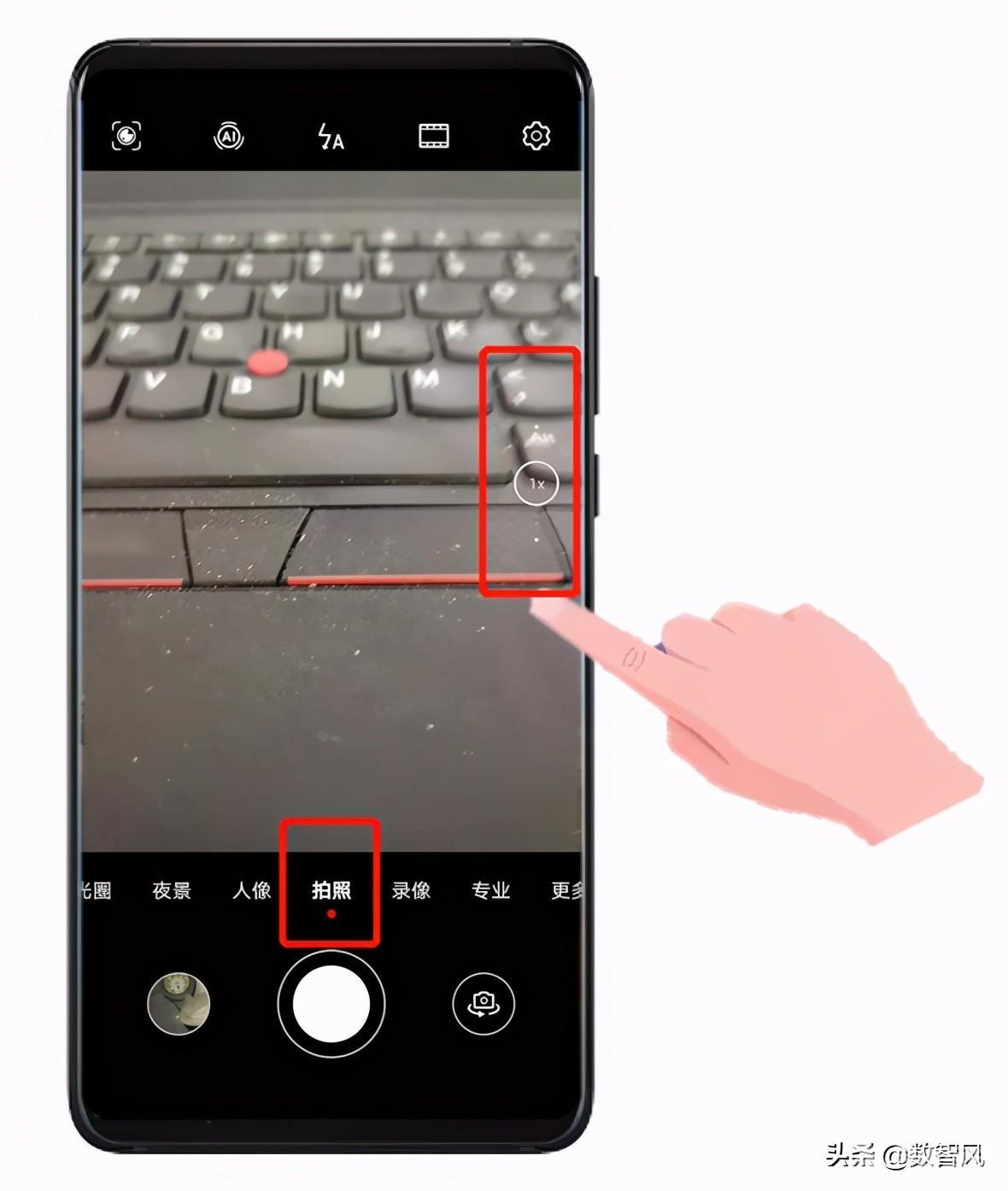 2、在相机界面,系统默认会停留在“拍照”模式。仔细观察屏幕,成像区域的右侧有2个白点加上一个“1X”的字样。值得注意的是,如果不是停留在拍照模式,需要先切换到“拍照”模式。