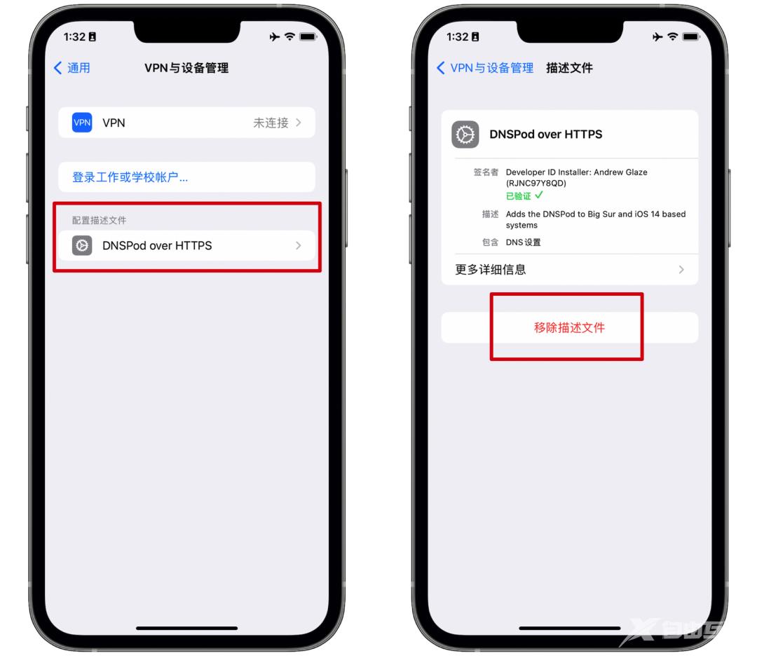 进入设置-通用-设备管理-找到前面安装的名为“DNSPod over”的描述文件,进行删除,然后重启iPhone就可以了,删除描述文件不会删除微信资料,可以放心使用。