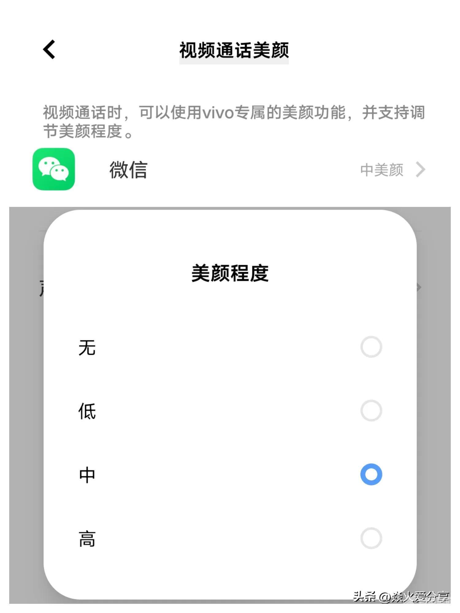 比如像我用的这台vivo手机,打开后还可以对美颜程度进行调节,有低中高三项。