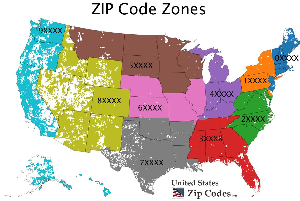 美国邮政编码的第一位数字通常代表一组美国州。邮政编码的第一位数,从东北到西海岸是按顺序分配的。邮政编码的前3位数字确定中央邮件处理分类,也称为分区中心,用于处理和分类邮件应该投递的区域。具有相同的前3位数字的所有邮件首先被传递到同一中心,在该中心根据后2位数字进行具体地点的分类并分发给本地邮局。