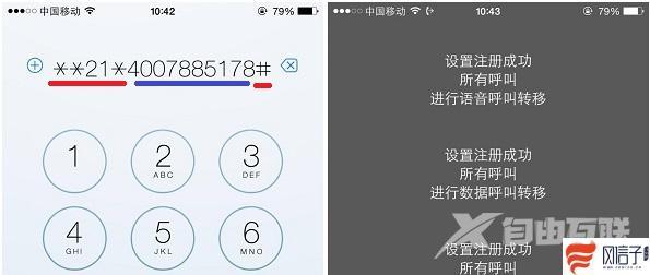 2、设定呼叫转移:**21*转移到的电话号码#,按呼叫钮后,2秒即可成功
