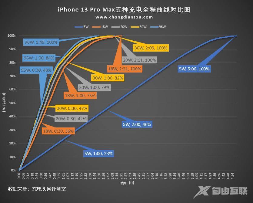 苹果官方推荐使用20W充电器,iPhone 13 Pro Max使用5W、18W、20W、30W、96W充电测试完毕后,直接贴出结论。电池容量最大的iPhone 13 Pro Max使用苹果96W充电器,快充功率达到9.05V 2.94A 26.7W,功率超过了苹果推荐的20W充电器,30W充电器性能才能满足iPhone 13 Pro Max。