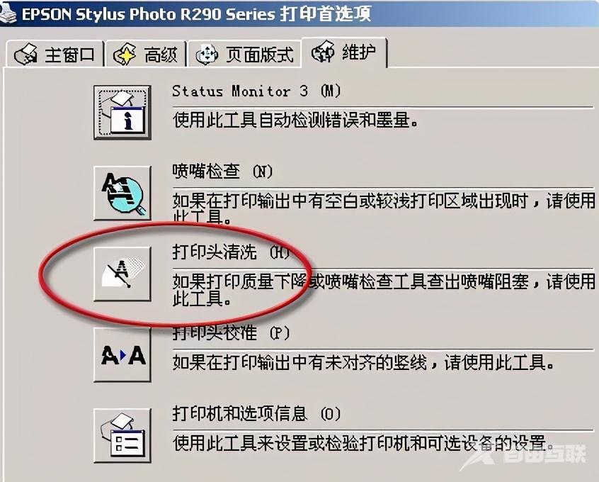 打开打印机维护界面后,大家可以看到有以下几个选项“打印头清洗”,“打印头校准”,“喷嘴检查”,接下来直接点击“打印头清洗”就可以了。