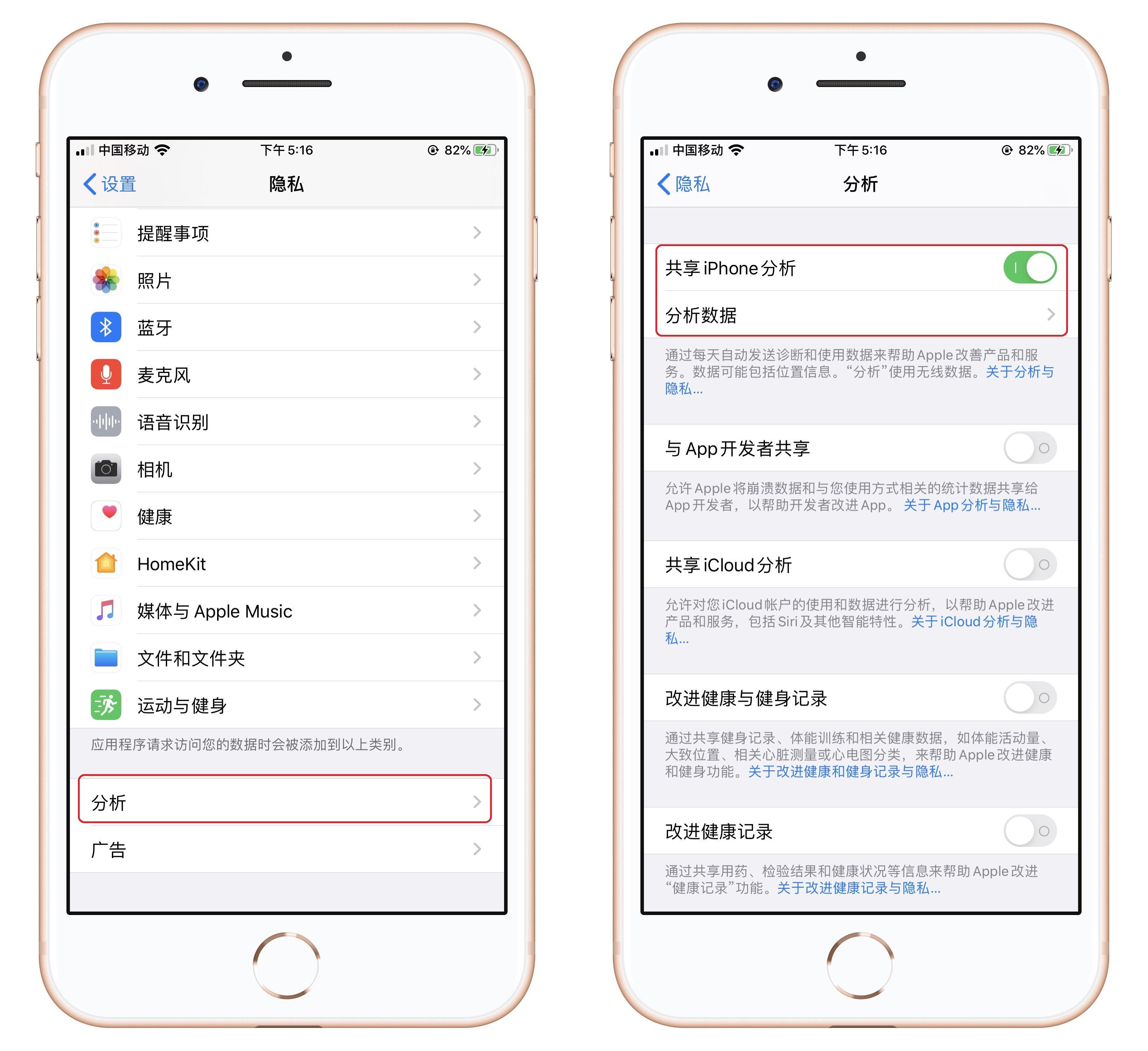 然后进入iPhone的【设置】-【隐私】-【分析】,开启【共享iPhone分析】,查看【分析数据】。如果之前一直是关闭的,等24小时以后再进入。