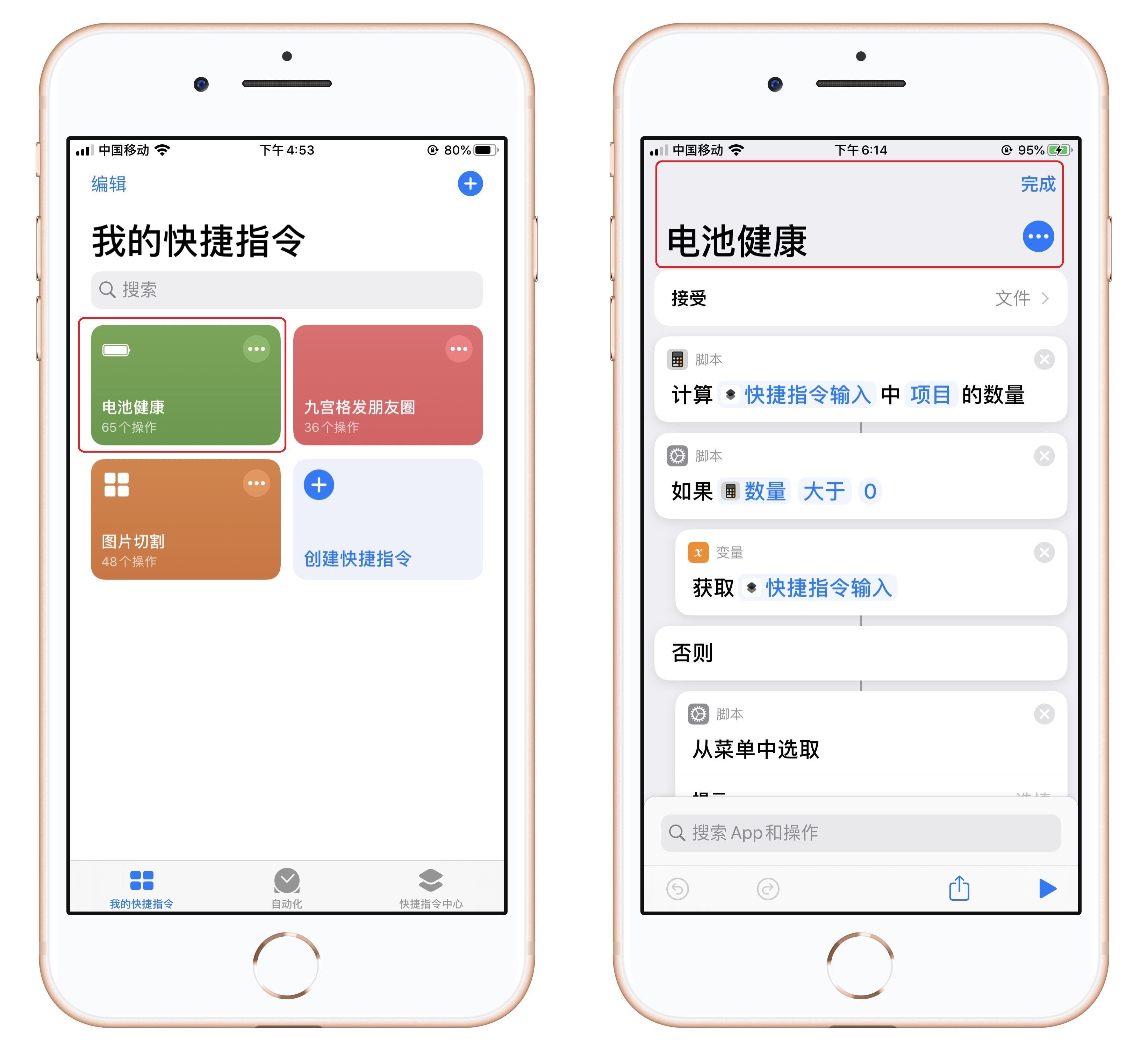 上面的方法,无法获取充电次数和电池容量数值,因此我们需要用到快捷指令,查看详细数据。在快捷指令中,先添加“电池健康”的快捷指令。